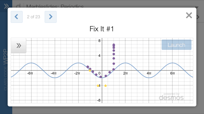 This is the ULTIMATE periodic functions graphing activity. After doing 3 or 4 games of the Polygraph activity in Part 2, students moved on to start Marble Slides. Here, students get to play around with the functions they were previously describing in mini challenges to create paths for marbles to follow and hit stars.
