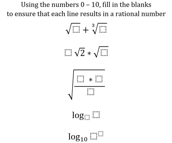 I believe that learning takes place when the boundaries of what is known and understandable are pushed. I presented the following problem in a similar way to the first one, although I had a brief class discussion about what “rational” numbers and a “surds” were.
