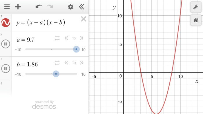 Next, we looked closer at specific features like roots and the vertex and tried some ways of preparing these ingredients to create bigger meals. I did this by graphing out Quadratics in factored form and vertex form and hitting play on the slider which changed its position and then the slider which changed its shape.
