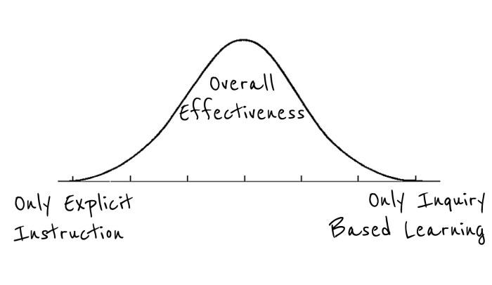 The reason I’ve written this is to show that there is a place in between. In society, we can easily find ourselves looking through a bias lens based on our perception of the author or speaker. Craig Barton, I feel through his book, How I Wish I’d Taught Maths, has allowed me to overcome any bias and freely agree or disagree with key points he raises, realising that research should inform what we do but not determine it. I have heard of some instances where teachers are being told which specific worked examples they are expected to show students, which I believe is an over-the-top interpretation of outcomes from researchers with little to no teaching experience. Craig, however, has outlined where he came from as a teacher and where he is at now – so at the very least, I can start from a place of agreement and be challenged from there, changing as needed but not unconditionally. I feel that this is really important to realise that teaching with an inquiry approach is not completely void of explicit instruction and vice-versa, and also that although processes and rationale may vary, neither one is completely superior to the other. I do, however, believe one on their own is lesser than somewhere between the two. I’ve used a bell shape curve below to try and show this in a simplistic way: