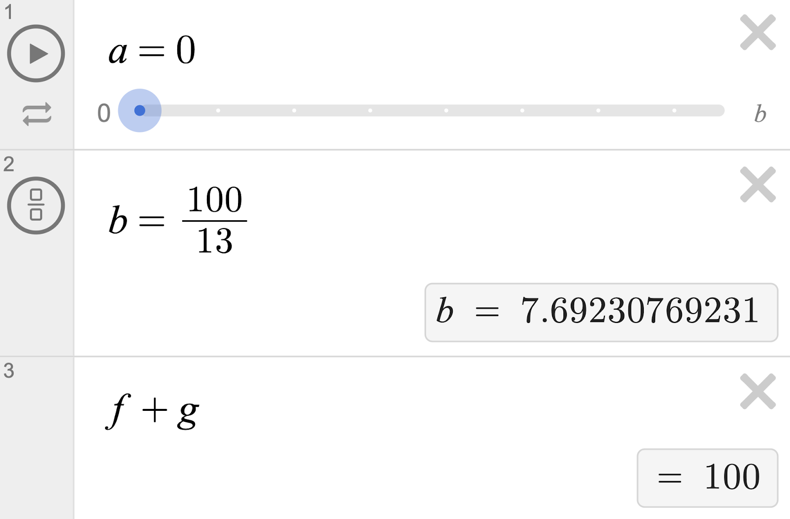 This result also struck a chord with me – 0 and 33⅓ was a solution for the original problem, and 0 and 20 was a solution to this new one. In terms of 100, that’s ⅓ then ⅕. I was surprised it wasn’t 25, which would’ve been ¼, but this is how it turned out and I was interested to see what fraction might pop out if we wanted the seventh number to be 100.