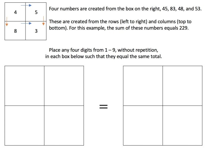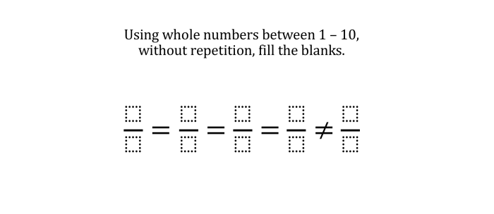 I first came across the Open Middle problems after I read the Classroom Chef. Just like the Which One Doesn’t Belong Problems, I got pretty addicted to using these kind of problems to present challenging tasks to my students. Here are some that I have created myself: